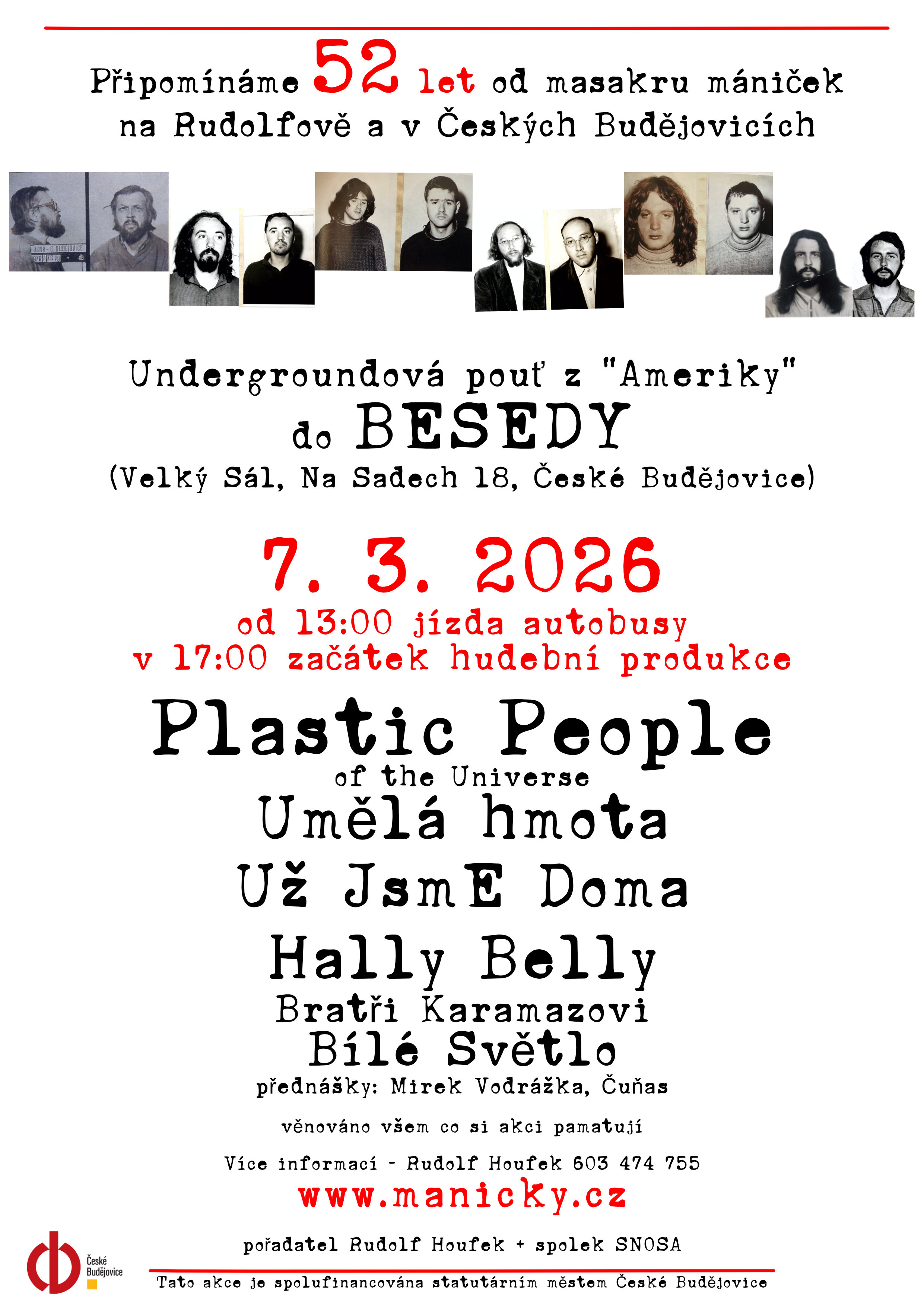 | sobota | 7.3.2026 | 16:00 | Undergroundová pouť z Ameriky do BESEDY. Beseda, Velký Sál, České Budějovice, Na Sadech 18 |